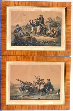 Hartwig W. Jab - "Return from first journey" e "Children of the sea". Coppia di incisioni colorate a mano all'epoca. In cornici.