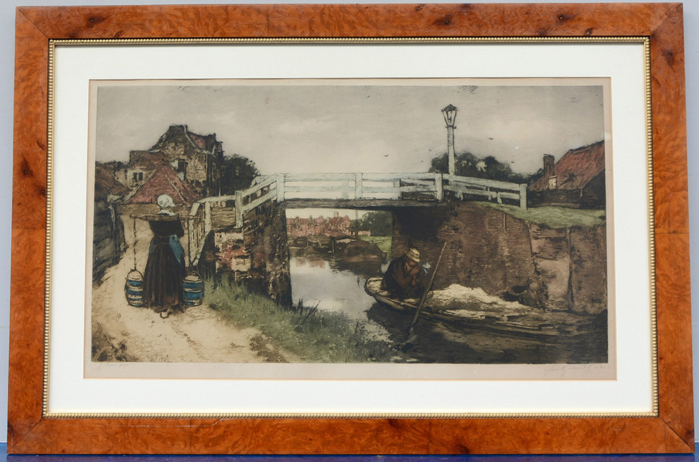 "Paesaggio con signora e ponte". Acquatinta (450x780 mm) a colori, firma...