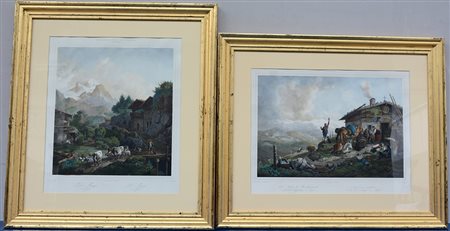 Heinrich Bürkel (1802-1869) - "Neue Malerwerke aus Munchen-Der Morgen in Tyrol" e "Die Ruhe der Maulthiertreiber". Due incisioni colorate a mano (rispettivamente 390x357 mm e 310x455 mm). In cornici.
