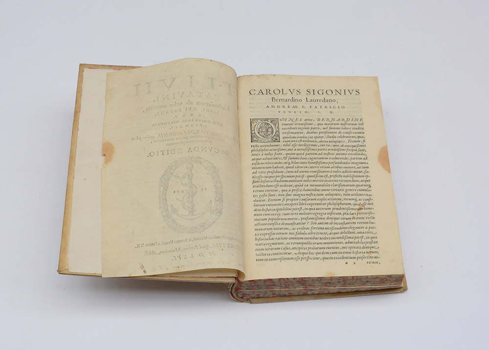 LIVIO, Tito (59 A.C.-17 D.C.). Historiarum ab urbe condita, libri, qui extant, XXXV cum universae historiae epitomis... secunda editio. Venezia: Paolo Manuzio, 1566. [Legato con:] SIGONIO, Carlo (1520-1584). Caroli Sigonii Scholia, quibus T. Liuii Patauini historiae, et earum epitomae partim emendantur, partim etiam explanantur. Eiusdem in eosdem libros Chronologia, ipsorummet auctorum verbis confirmata. Venezia: Paolo Manuzio, 1566. Seconda edizione Aldina ampliata delle storie di Roma di Livio. 2 opere in un volume, folio (290 x 197mm). Marche tipografiche, capilettera incisi in legno (prima opera senza bianca a6; seconda opera senza N4-O4; alcune bruniture). Legatura posteriore in vitello, tagli marmorizzati (tracce di muffa). Provenienza: Giuseppe Carpani (nota di possesso).