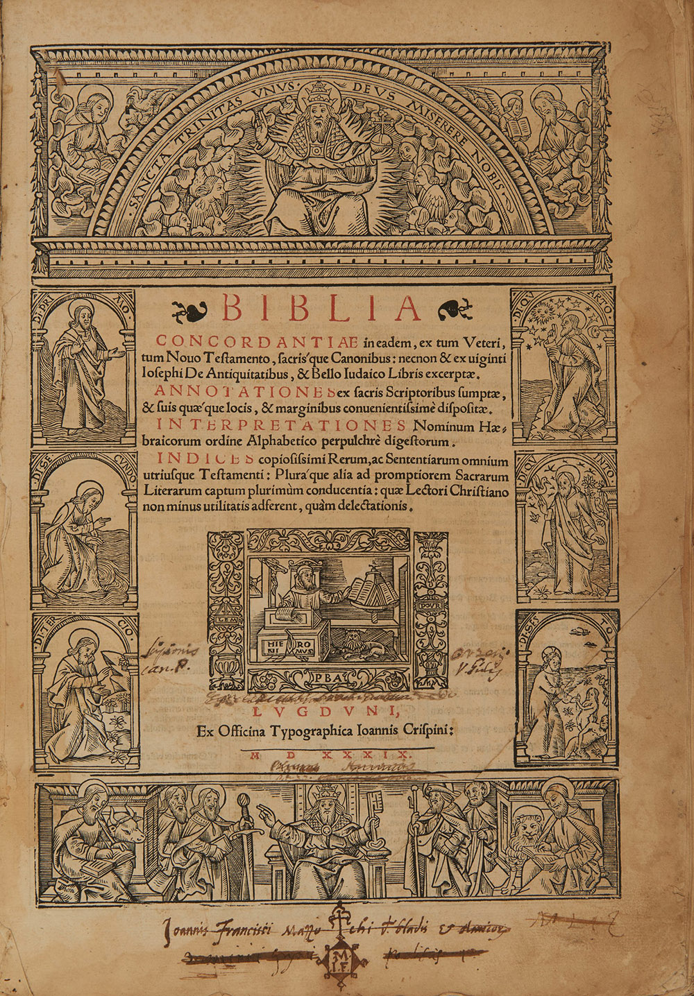 Biblia Concordantiae in eadem, ex tum Veteri, tum Novo Testamento. Lione: Giovanni Crispino, 1539-40. Folio (360 x 250mm). Frontespizio in rosso e nero in elaborata cornice xilografica, grande xilografia all’inizio della Genesi e altre illustrazioni xilografiche nel testo, capilettera incisi in legn (manca il foglio D4). Legatura in cartone posteriore (lievemente macchiato). Provenienza: Giovanni Francesco Mazzo (antica nota di possesso).