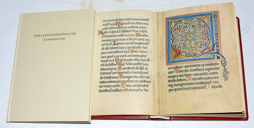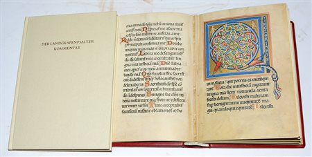 (Libri-facsimile) Der Landgrafenpsalter, facs. del ms. HB II 24 della Württembergische Landesbibliothek di Stuttgart, Graz, Akademische Druck– u. Verlagsanstalt, 1992. Volume riproducente il manoscritto con le miniature a colori e in oro. Legatura in piena pelle rossa e impressioni dorate. In cofanetto. Allegato un volume di commentario. Tiratura limitata a 480 esemplari