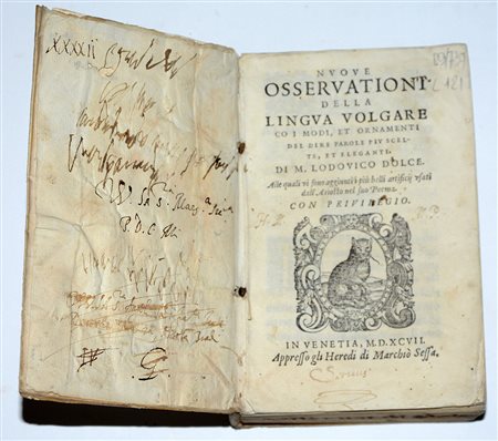DOLCE, Lodovico. Nuove osservationi della lingua volgare... Venezia: Heredi di Marchiò Sessa, 1597. 8vo, con bella marca tipografica al frontespizio e capolettera xilografato. Appunti manoscritti sul contropiatto. Legatura coeva in piena pergamena. Titolo manoscritto sul taglio inferiore (lievi difetti).