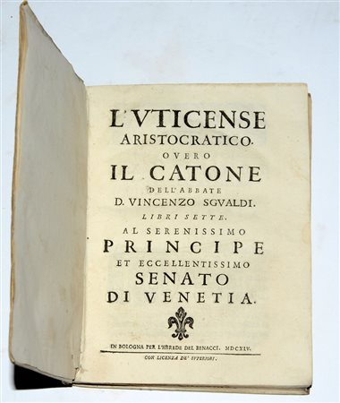 SGUALDI, Vincenzo. L'Uticense aristocratico overo il Catone. Bologna: Benacci, 1645. 4to, con numerosi capilettera xilografati. Legatura coeva in piena pergamena con titolo manoscritto al dorso (lievi difetti).