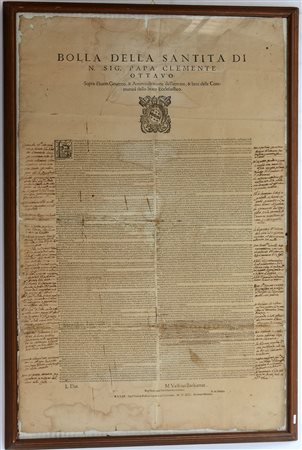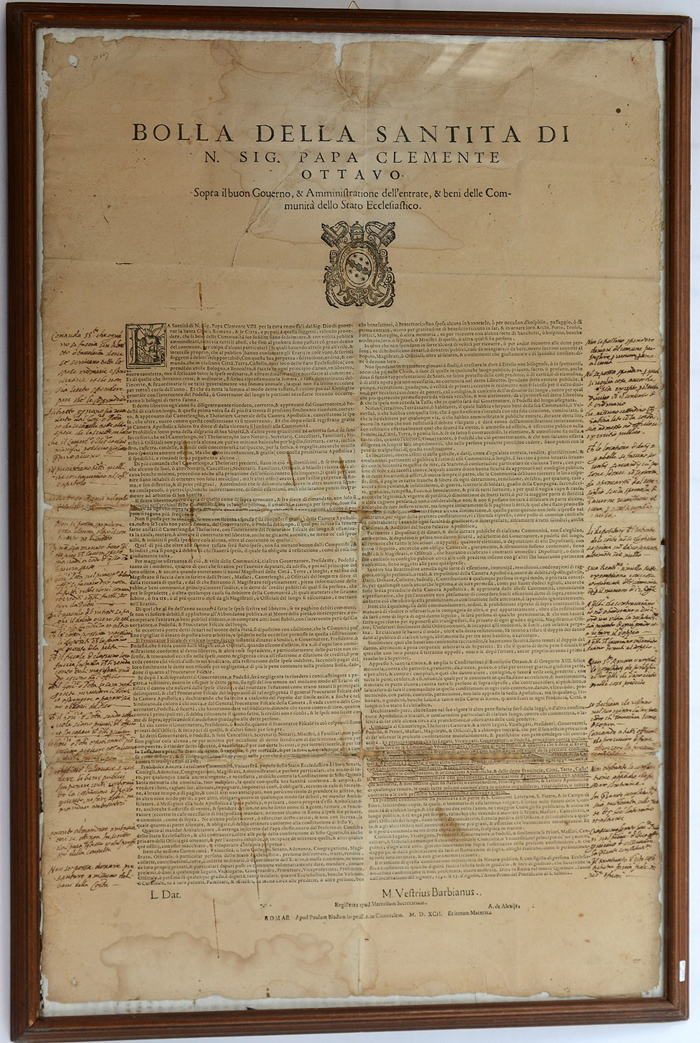 Bolla della Santità di Nostro Signore Papa Clemente Ottavo, Sopra il buon governo, & Amministratione dell'entrate, & beni delle Comunità dello Stato Ecclesiastico. Registrata apud Marcellum Secretarium. Romae: Apud Paulum Bladum impressorem Cameralem, 1592. Foglio cartaceo (750 x 490mm). In cornice (macchie d'umidità e tagli nel foglio in prossimità del testo).