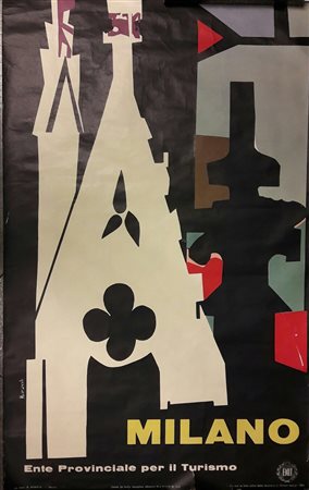 Marcello Nizzoli. Milano. Ente Provinciale per il Turismo. Milano: Grafiche N. Moneta (c. 1955). (100x62cm). (Alcuni strappi minori ai margini e piccolo strappo al centro).