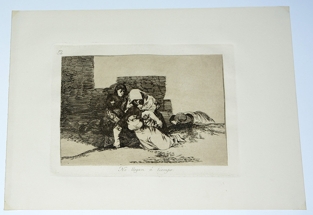 Goya Y Lucientes Francisco Fuendetodos 1746 Bordeaux 1828 (Libri-Incisioni) "No llegan a tiempo" Incisione (cm 15,5x20,5) tratta dalla serie "I Disastri", con il vecchio numero "38" lievemente visibile in basso a sinistra.