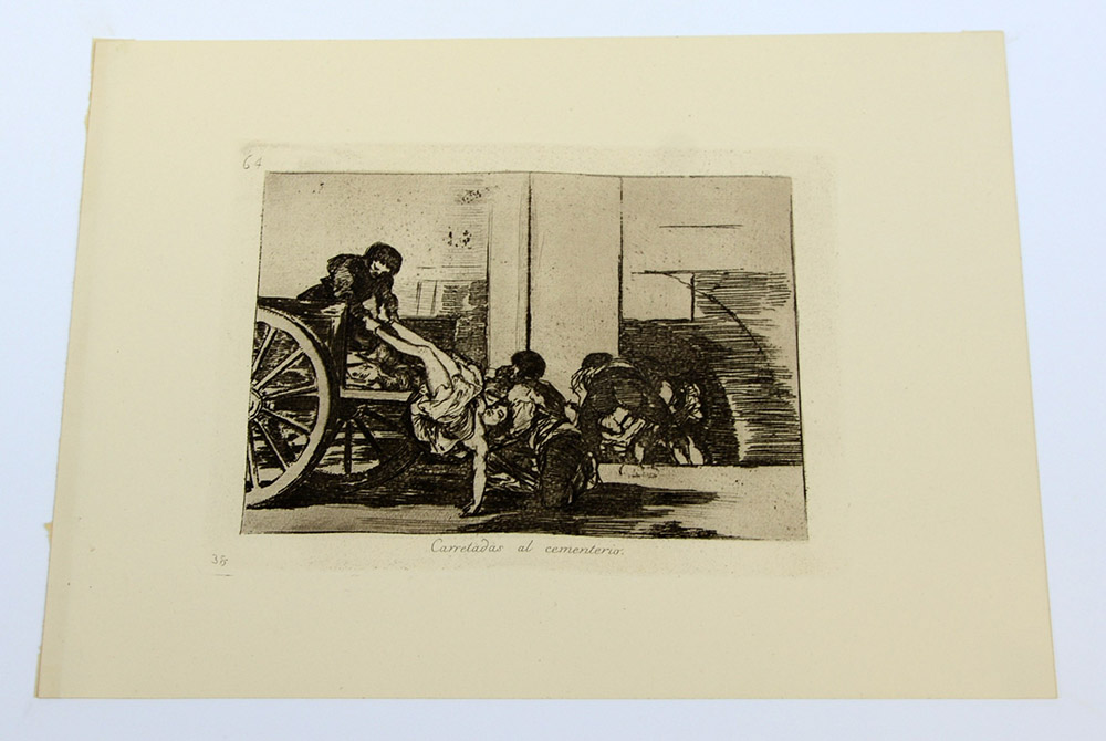 Goya Y Lucientes Francisco Fuendetodos 1746 Bordeaux 1828 (Libri-Incisioni) "Carretadas al cementerio" Incisione (cm 15,5x20,5) tratta dalla serie "I Disastri", con il vecchio numero "38" in basso a sinistra.