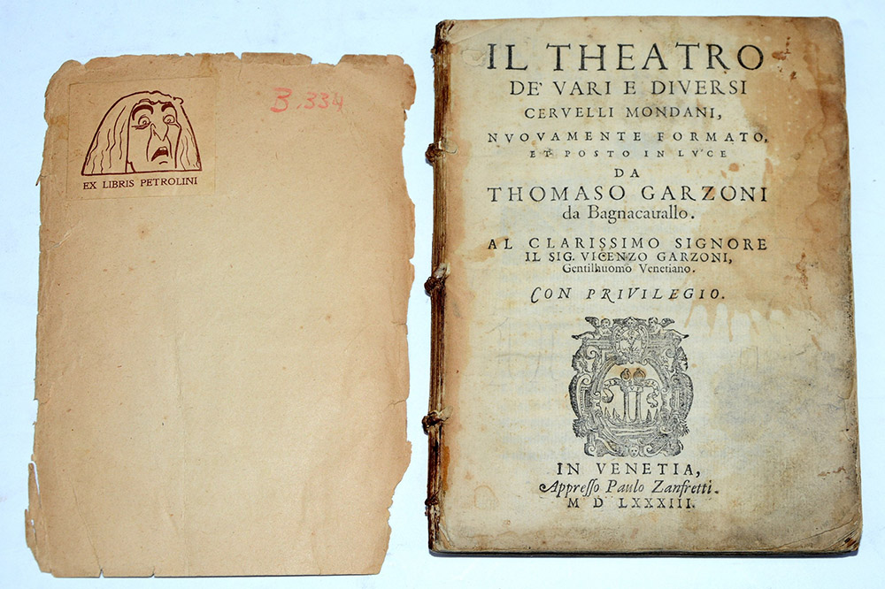 GARZONI, Tommaso (1549-1589). Il theatro de' vari e diversi cervelli mondani. Venezia: Paolo Zanfretti, 1583. Rara prima edizione di questo trattato di psicologia che studia la tipologia morale dei vari cervelli. 4to (195 x 144mm). Marca tipografica al frontespizio (alcune macchie più accentuate nelle prime pagine e sul titolo). Legatura in cartone moderno (molto rovinata). Provenienza: Petrolini (ex libris).
