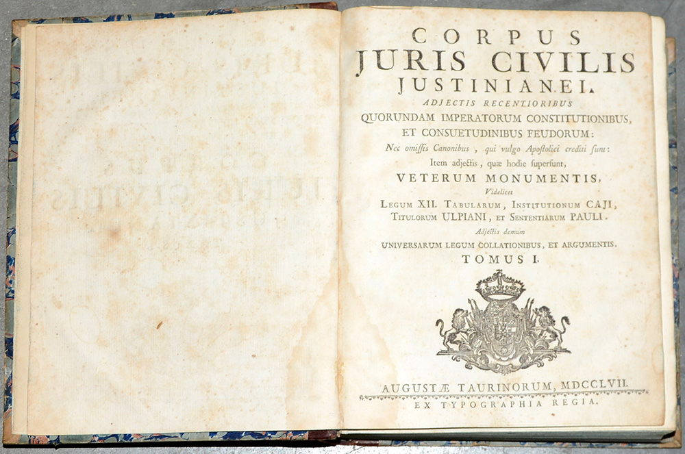 Corpus Juris Civilis Justinianei. Torino: Tipografia Regia, 1757. Due voll. in 4°, rilegati in mezza pergamena e piatti marmorizzati, taglio verde (lievi difetti)