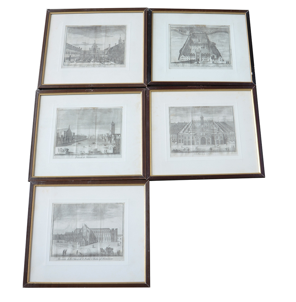 Bel gruppo di cinque incisioni in bianco e nero raffiguranti diversi monumenti di città straniere, come Londra e Cambridge. In cornici.