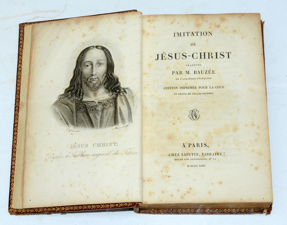 M. Bauzée. Imitation de Jésus-Christ. Parigi: Chez Santin, Librairie, 1822. Volume con ritratto di Gesù in antiporta e alcune incisioni fuori testo. Legatura molto bella in piena pelle coeva con impressioni in oro (lievi difetti ai piatti e al dorso, fioriture diffuse).