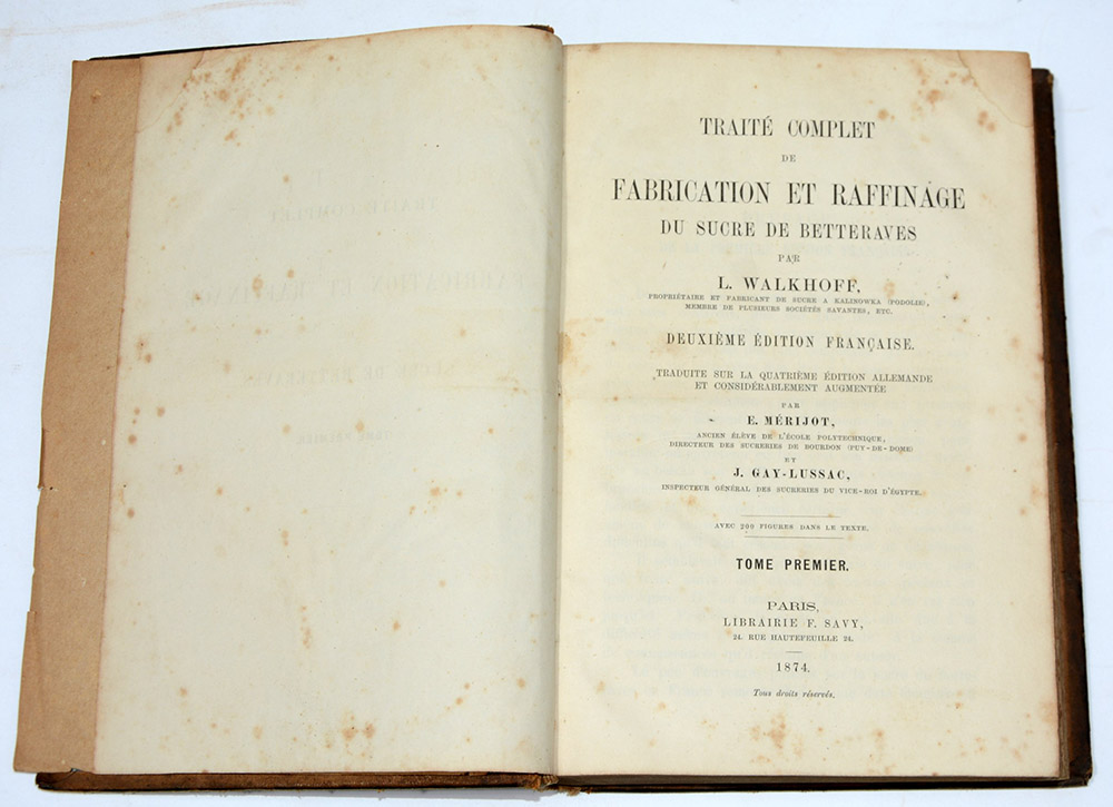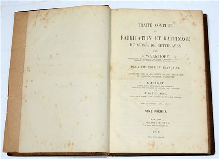 L. Walkhoff. Traité complet de fabrication et raffinage du sucre de betteraves. Parigi: Librairie F. Savy, 1874. Due volumi con illustrazioni in bianco e nero. Legatura coeva in piena pelle (fioriture diffuse).