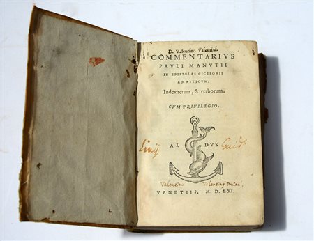 Commentarius Pauli Manutii in Epistolas Ciceronis ad Atticum. Venezia: Paolo Manuzio, 1561. Volume 8vo. Marca tipografica sul frontespizio e in fine (gore di umidità). Legatura in piena pergamena di riuso, tracce delle bindelle di pergamena sui piatti (difetti).
