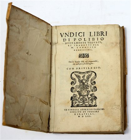 Undici libri di Polibio nuovamente trovati, et tradotti per M. Lodovico Domenichi. Venezia: Giolito Ferrari, 1553. Volume 8vo. Marche tipografiche di Giolito sul frontespizio e in fine. Legatura coeva in piena pergamena con titolo manoscritto sul dorso; traccia delle bindelle di pergamena sui piatti (difetti). Prima traduzione in Italia di questa parte delle Storie di Polibio, dopo l'ed. di Basilea del 1549.