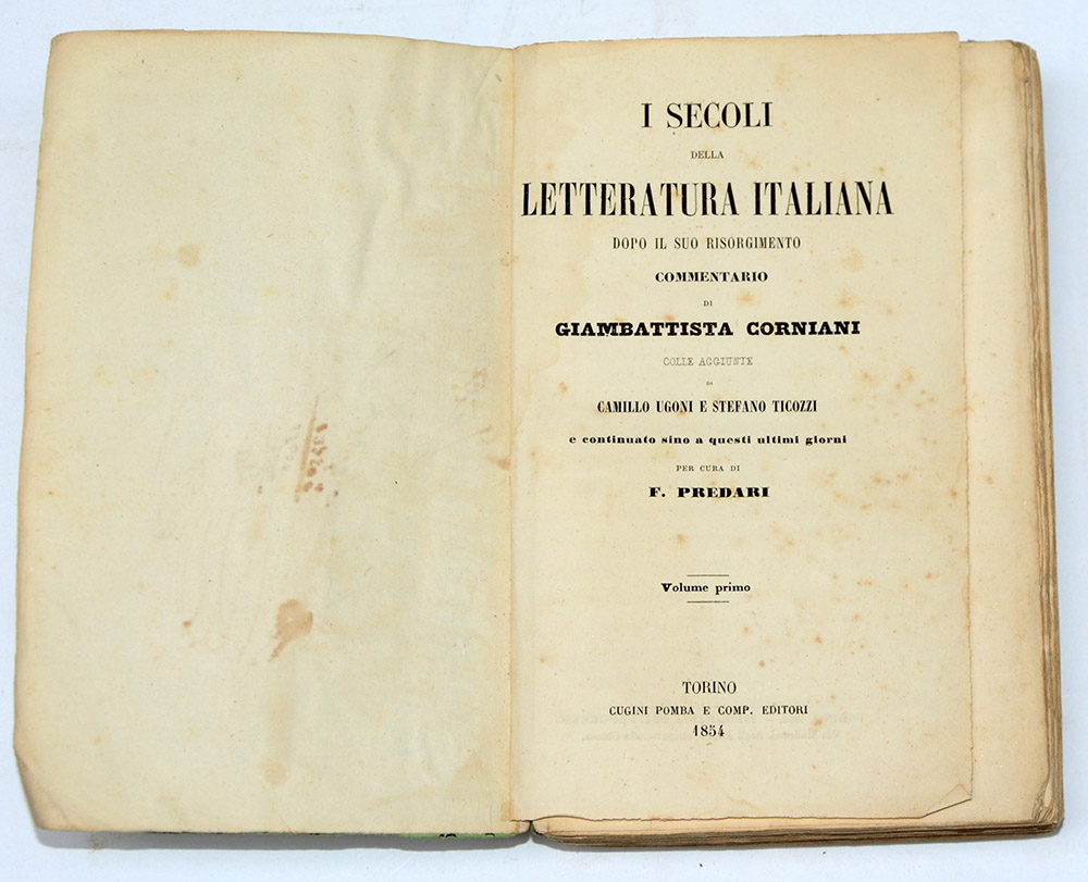 CORNIANI, Giambattista. I secoli della letteratura italiana dopo il suo risorgimento. Torino: Cugini Pomba e comp. editori, 1854-56. 8 volumi 8vo. Legatura in carta verde con titolo manoscritto al dorso (lievi difetti).