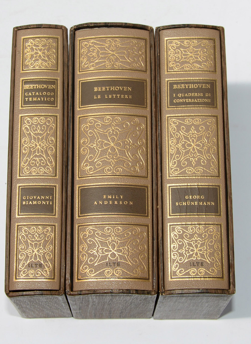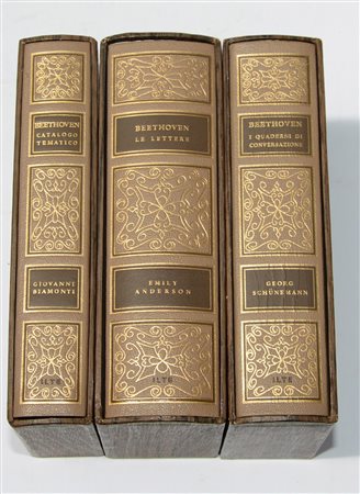 ANDERSON, Emily. Le lettere di Beethoven; BIAMONTI, Giovanni. Catalogo cronologico e tematico delle opere di Beethoven; SCHUNEMANN, Georg. I quaderni di conversazionedi Beethoven. Torino: ILTE, 1968. 3 volumi 8vo. Legatura editoriale, taglio dorato. In cofanetto.