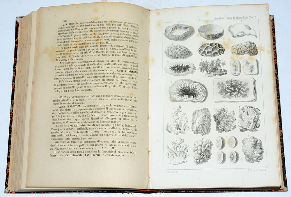 ROMBICCI, Luigi. Corso di Mineralogia. Bologna: Tipografia Fava e Garagnani, 1873. 3 volumi 4to. Seconda edizione ricca di illustrazioni e tavole fuori testo in bianco e nero e a colori (fioriture e gore diffuse). Legatura in mezza pelle con piatti marmorizzati (lievi difetti).