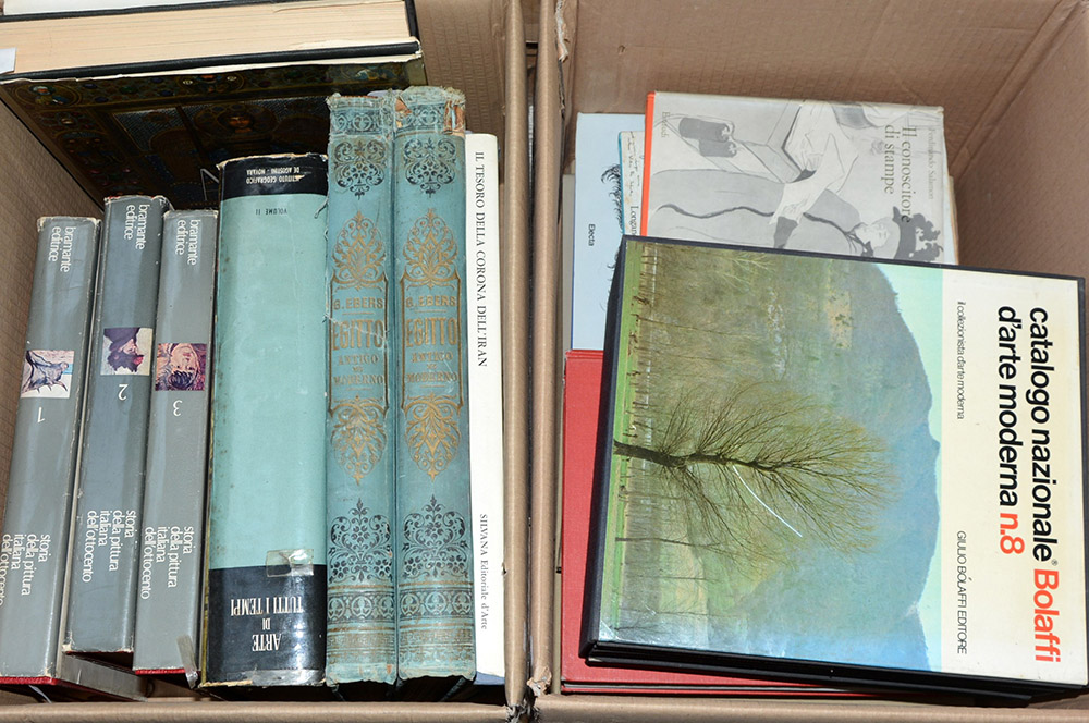 Lotto di due cartoni contenente svariati volumi di diverso formato, relativi principalmente l'arte e le tecniche decorative.