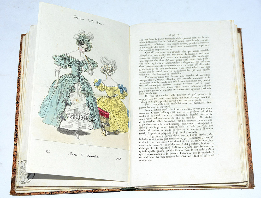 Lotto composto da 6 volumi del Corriere delle dame, anni 1832-1834. Legatura coeva in mezza pelle e piatti marmorizzati (lievi difetti).