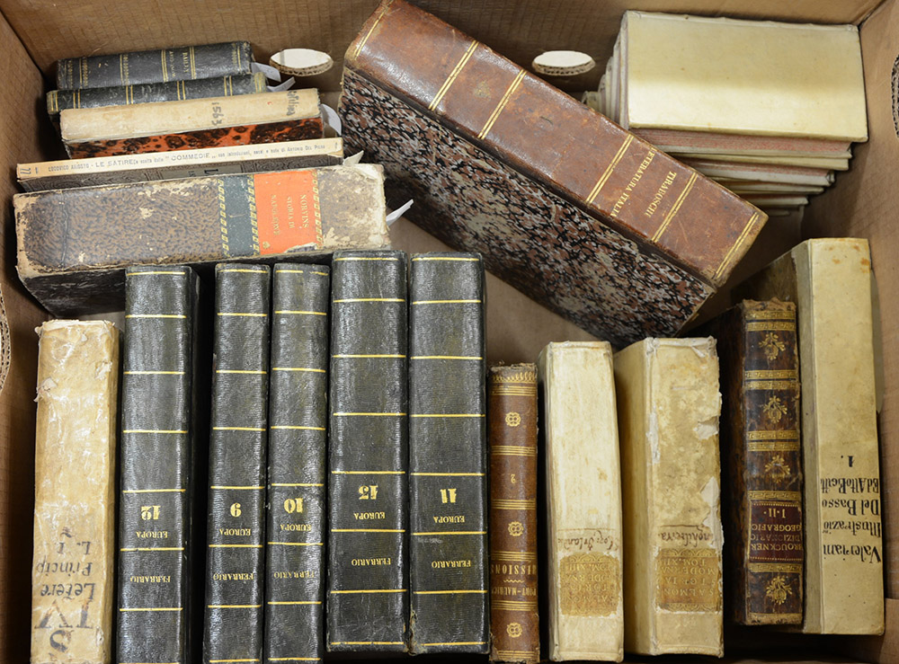 Cartone contenente svariati volumi di diversa epoca, di argomento principalmente storico-letterario e geografico (difetti).