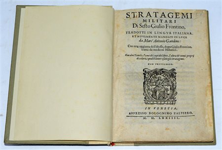 Lotto composto da: - FRONTINO, Sesto Giulio. Stratagemmi militari. Venezia: Bolognino Zaltiero, 1574. Legatura moderna in mezza pergamena. - GUICCIARIDNI, M. Francesco. La historia d'Italia. Treviso: Fabrizio Zanetti, 1604. Legatura in mezza pelle (difetti).