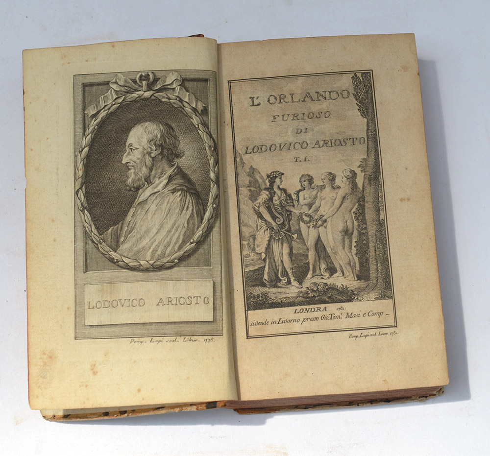 ARIOSTO, Ludovico. Orlando Furioso. Londra: Tommaso Masi & Comp., 1781. 4 volumi 12mo. Frontespizio inciso e ritratto dell'autore inciso in antiporta; svariate illustrazioni in bianco e nero (fioriture e bruniture). Legatura in mezza pelle e piatti marmorizzati, taglio rosso (difetti).