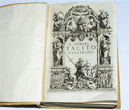 Opere di G.Cornelio Tacito. Annali, Historie, Costumi de' Germani, e vita di Agricola illustrate. Venezia: Giunti, 1618. Volume 4to. Marca tipografica al frontespizio (stampato in rosso e nero) e all'antiporta, bella incisione in antiporta, fregi e capilettera xilografati. Legatura in mezza pergamena con titolo manoscritto al dorso .