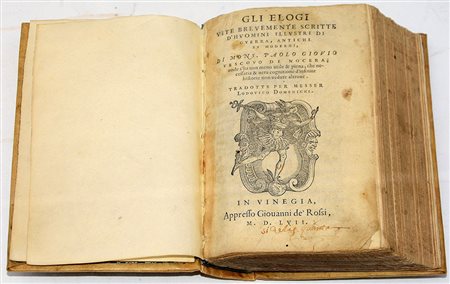 Gli elogi. Vite brevemente scritte d'huomini illustri di guerra... Venezia: Giovanni de' Rossi, 1557. Volume 8vo. Marca tipografica sul frontespizio e capilettera xilografati (lievi fioriture). Legatura recente in piena pergamena.