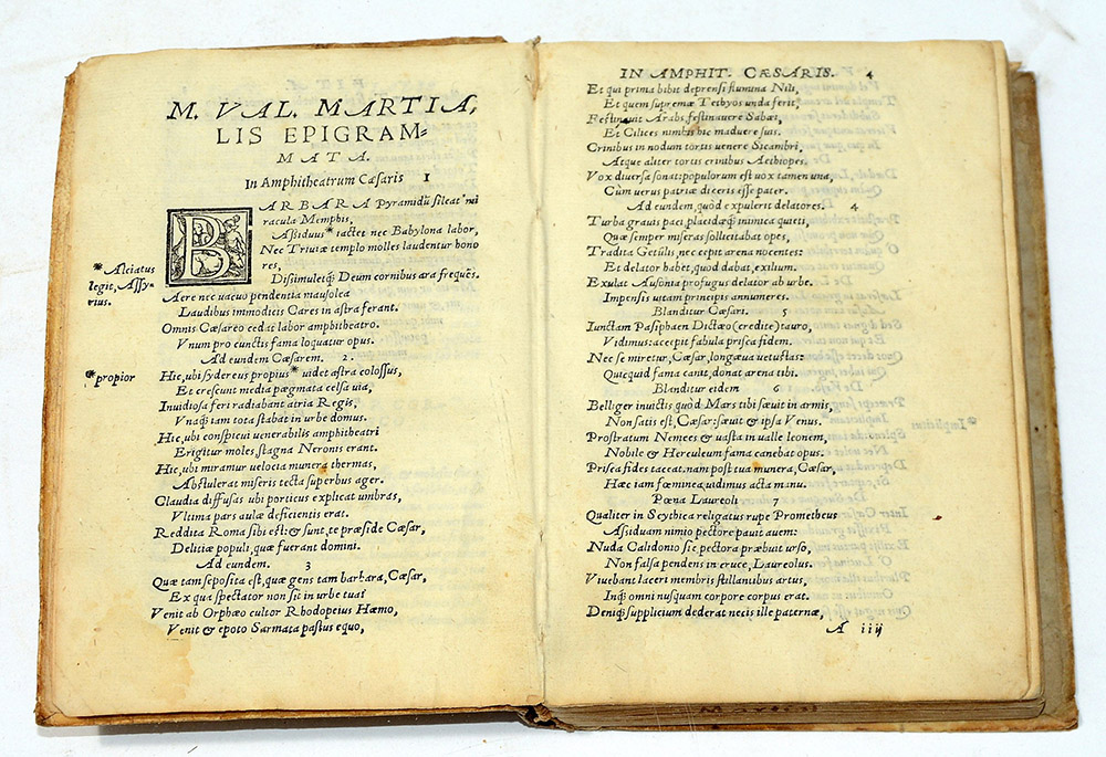[MARZIALE, Marco Valerio] -- Martialis Epigrammaton Libri XIIII. Venezi: Girolamo Scoto, 1549. Volume 8vo. Marca tipografico al frontespizio, capilettera xilografati (lievi gore). Legatura in piena pergamena (difetti).