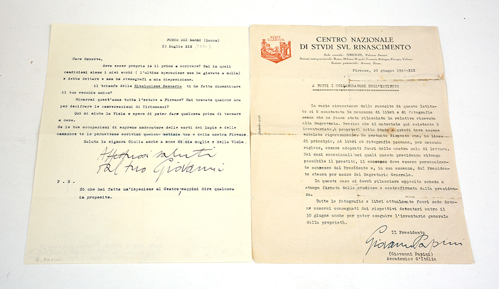 [PAPINI, Giovanni]. Due documenti cartacei dattiloscritti di notevole interesse firmati da Giovanni Papini, Accademico d'Italia, datati entrambi al 1941 (lievi difetti al supporto cartaceo).