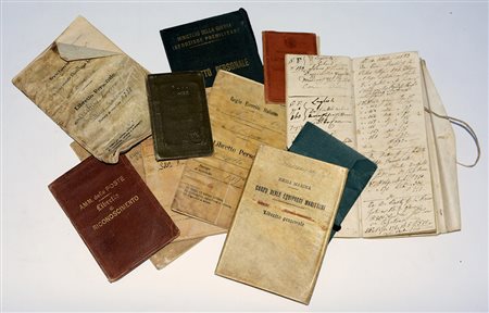 Cartone contenente diverso materiale manoscritto d'argomento storico, alcune piccole pubblicazioni, libretti personali (difetti) e una raccolta di segnalibri in cornice (lievi difetti).