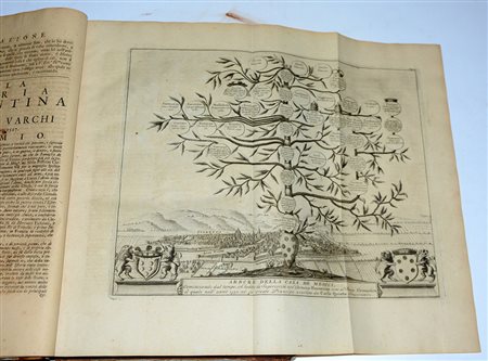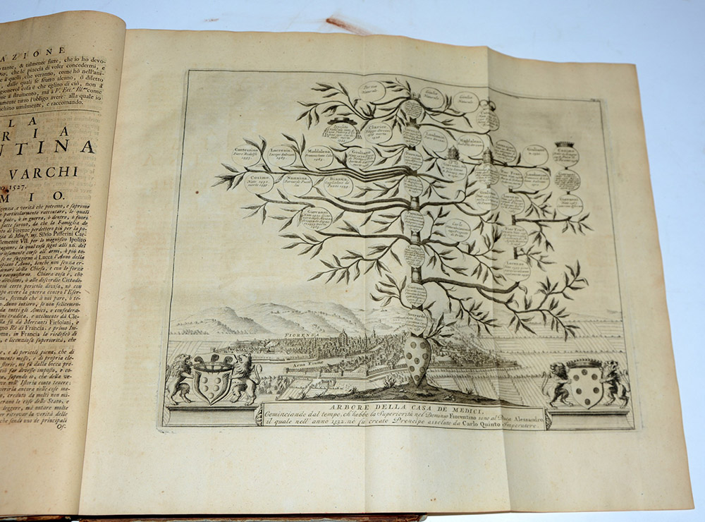 VARCHI, Benedetto. Istoria delle Guerre della Repubblica Fiorentina. Leida: Pietro Vander, [s.d.]. Volume in folio. Alcune incisioni in bianco e nero fra cui un albero genealogico a doppia pagina ripiegata. Legatura recente in mezza pelle e piatti cartonati (difetti dovuti all'usura).