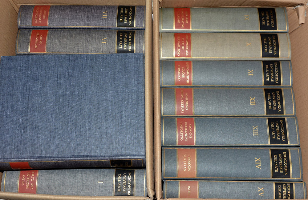 AA.VV. Enciclopedia Universale dell'Arte. Venezia-Roma, 1958-1967. 15 volumi in 4to, con numerose illustrazioni in bianco e nero e a colori. In piena tela. Lotto in due cartoni.
