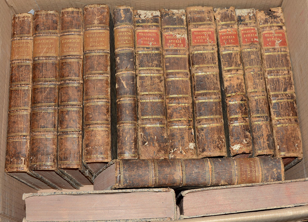 Cartone contenente undici volumi della Storia della letteratura italiana di Girolamo Tiraboschi. Legatura in mezza pelle (difetti).