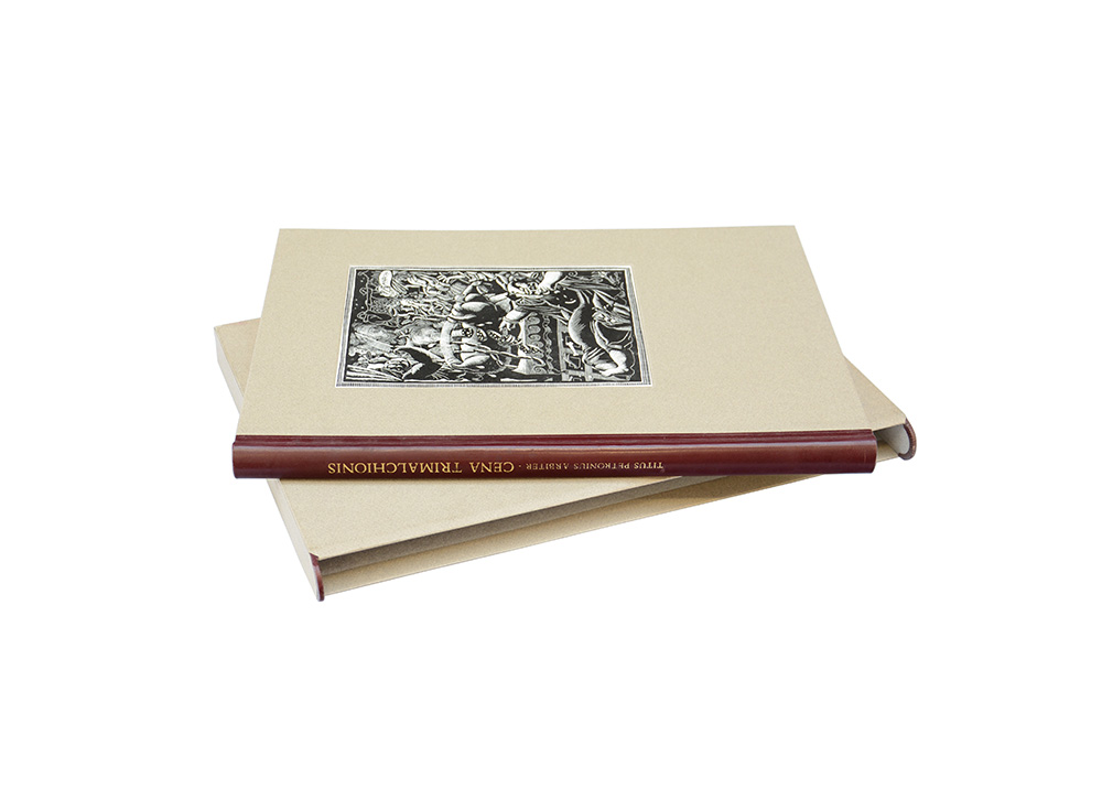 PETRONIO, Tito. Cena Trimalchionis. Milano: Edizioni Rovello, 1992. Volume in 4to. Legatura in cartonato editoriale con xilografia al piatto anteriore, titoli in oro al dorso rinforzato in pelle. Esemplare 149/170.