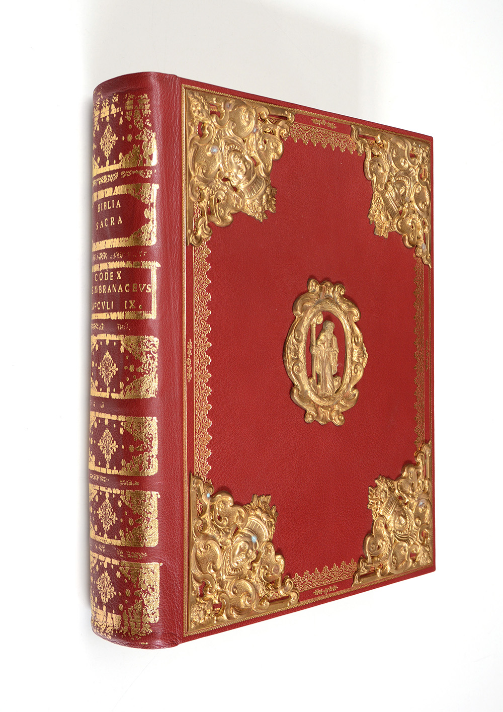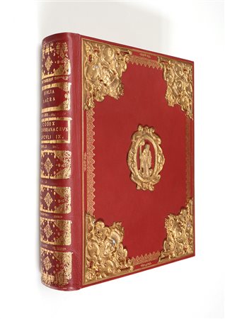 Biblia Sacra Codex Membranaceus Saeculi IX. Edizione in facsimile dall'originale conservato presso l'Abbazia di S. Paolo Fuori le Mura. Istituto Poligrafico e Zecca dello Stato, 1992. Legatura in piena pelle marocchino rosso con borchie in bronzo sui piatti. Esemplare 369/1000.