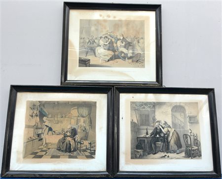 Lotto di tre litografie umoristiche a colori del secolo XIX, in cornici ebanizzate coeve (cm 52x62) (difetti)