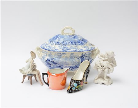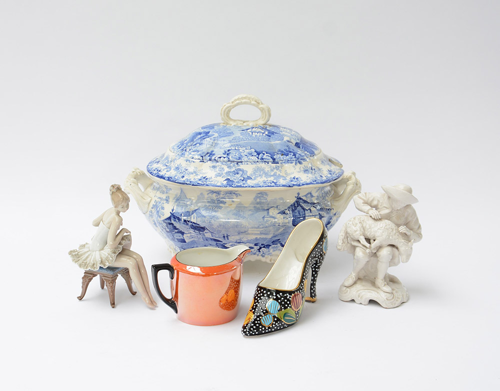 Lotto composto da una zupppiera con coperchio, una sculturina raffigurante pastorello con pecora, una sculturina Lladro raffigurante ballerina, una scarpetta ed una lattiera in ceramica e porcellana di diverse epoche e manifatture (difetti e mancanze)