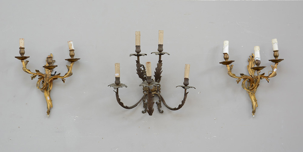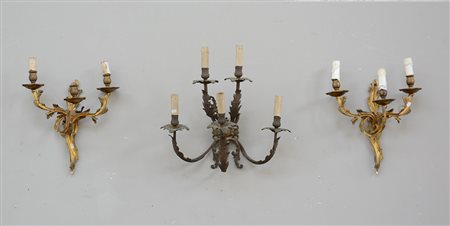 Lotto composto da una coppia di appliques a tre fiamme ed una applique a cinque fiamme, in bronzo, misure diverse (difetti)