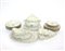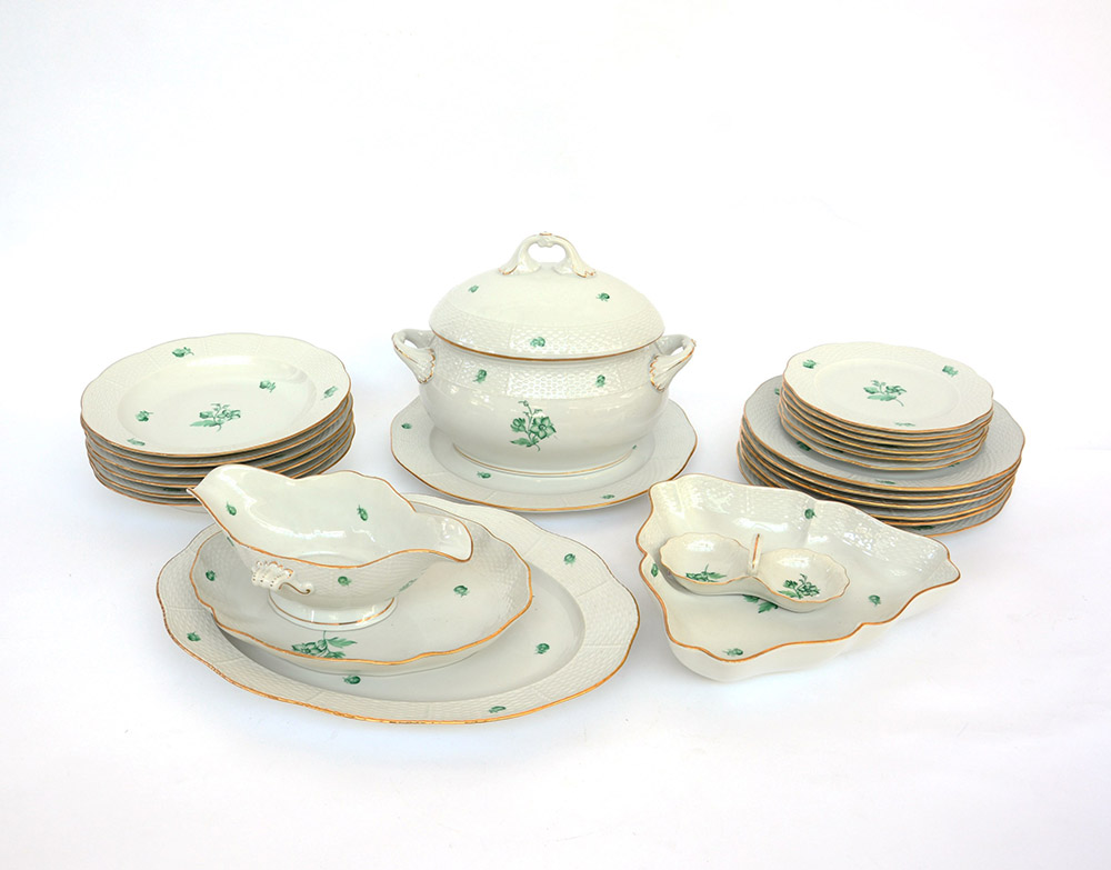 Manifattura di Herend, secolo XX, servizio di piatti da sei in porcellana decorata in verde a fiori con profilo dorato composto da : zuppiera con coperchio, due piatti da portata, due antipastiere, un sale e pepe, sei piatti fondi, sei piani e sei da dolce (lievi difetti)