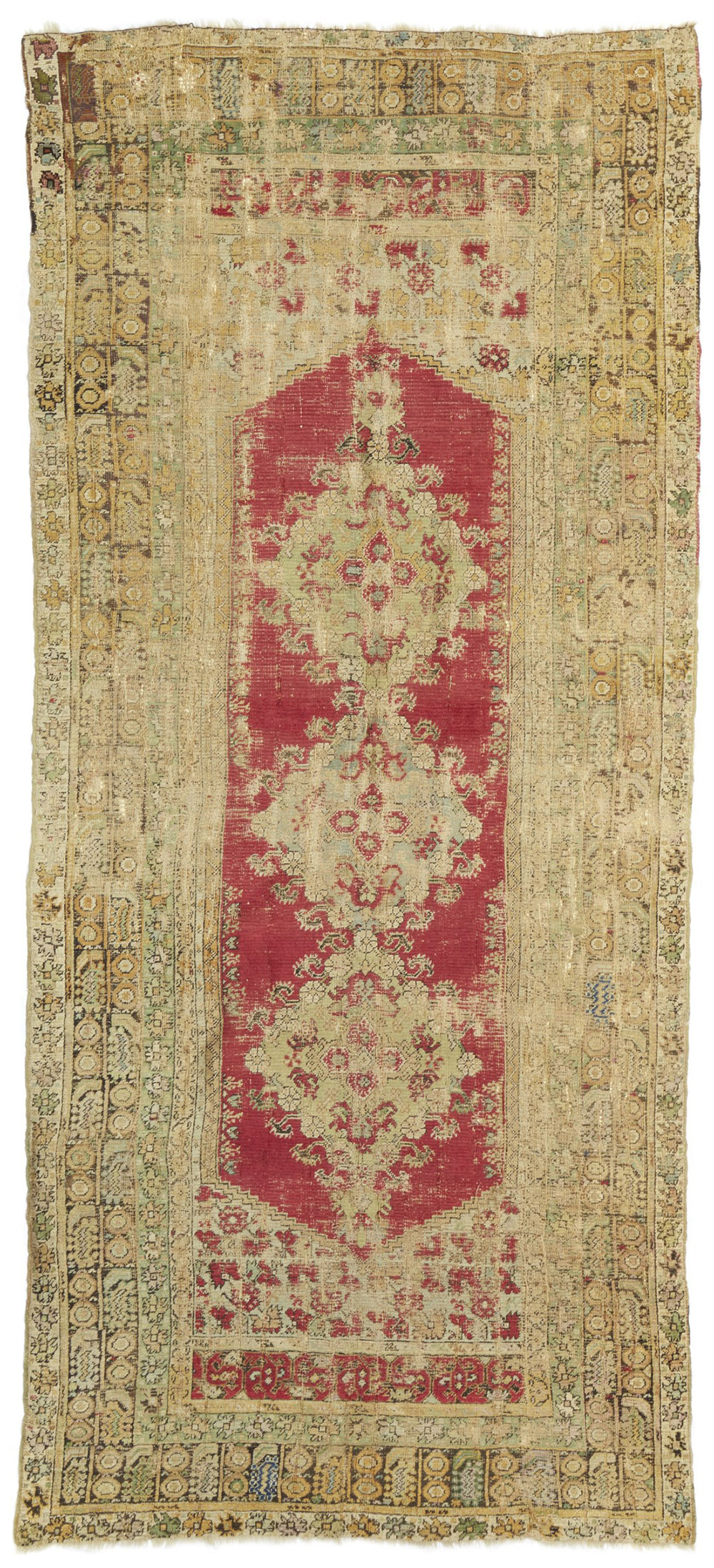 Tappeto Kirscheir Anatolia, sec. XVIII, disegno a tre medaglioni ottomani su fondo crema, campo rosso molteplici bordure nei toni del beige, verde e azzurro (cm 330x150) (gravi difetti) Kirscheir carpet. Anatolia, 18th century (major defects)
