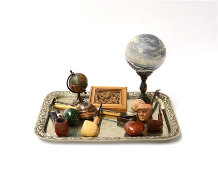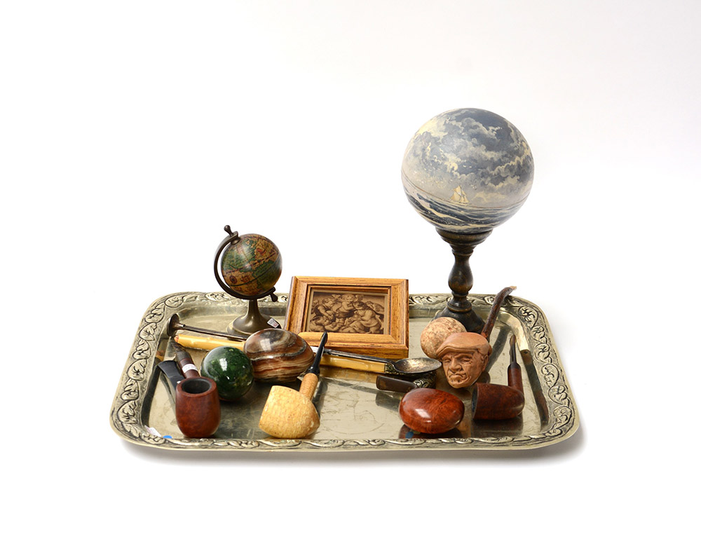 Lotto vario: un vassoio ed un mestolino in metallo, una sfera in legno dipinta con marina, un modellino di mappamondo, un piccolo bastone, un quadrettino sacro, una sfera in pietra, due uova in pietra dura, cinque pipe ed un bocchino (difetti e mancanze)