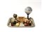 Lotto vario: un vassoio ed un mestolino in metallo, una sfera in legno...