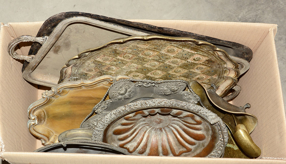 Cartone contenente vassoi ed alzatine di decoro, materiali e dimensioni differenti (difetti)
