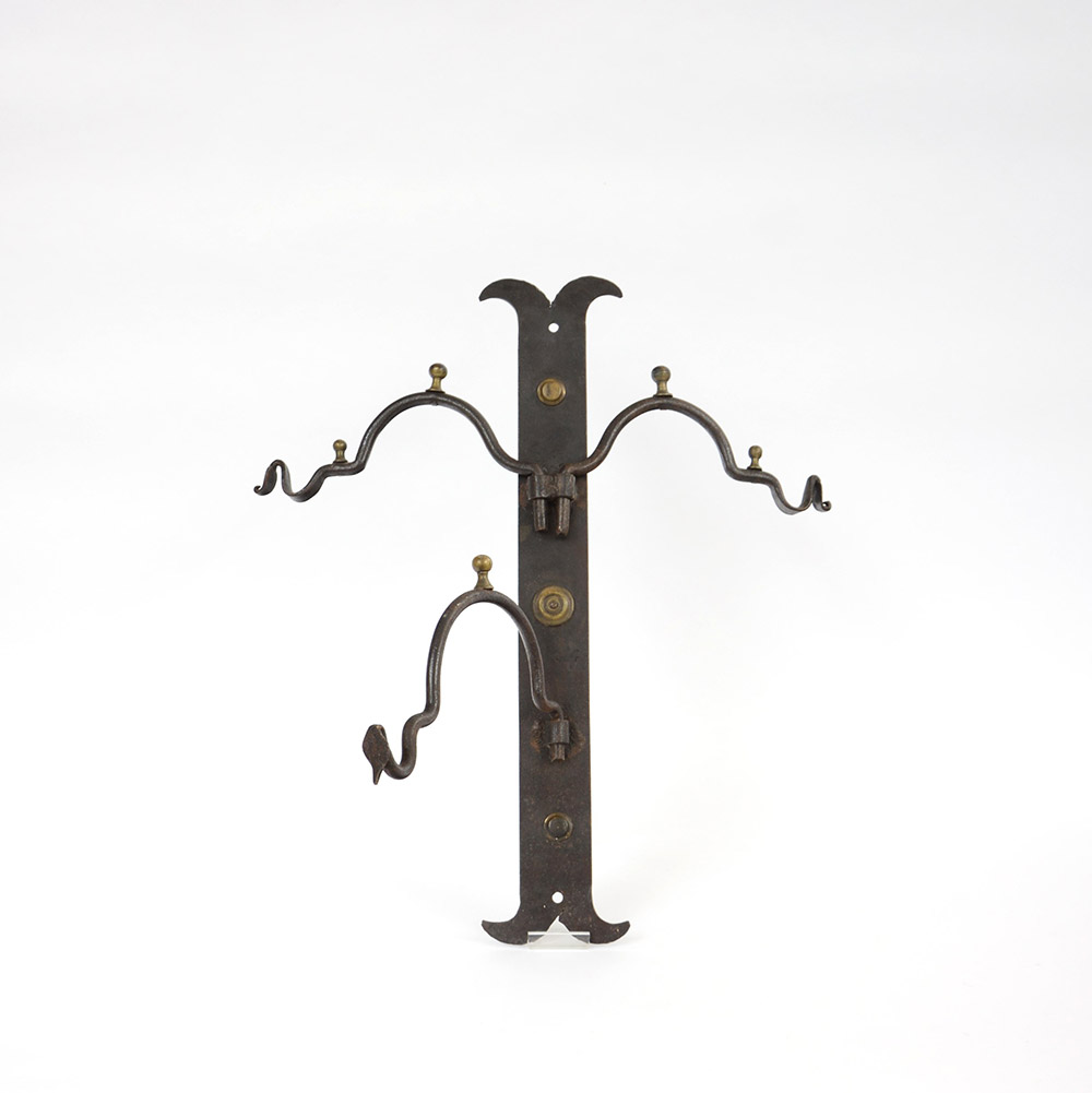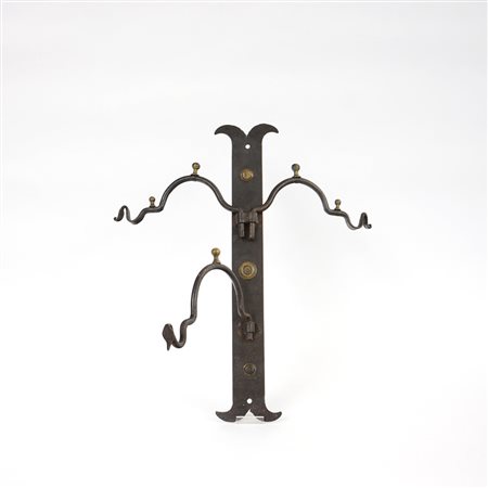 Gancio porta secchi a tre braccia in ferro battuto con elementi decorativi in ottone (h cm 58) (lievi difetti)