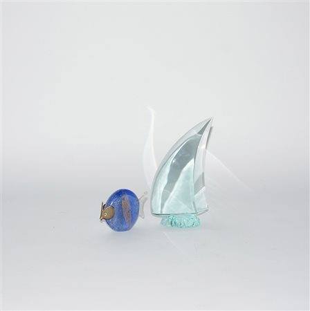 Lotto di una sculturina in cristallo raffigurante vela ed una in vetro e metallo raffgurante pesce, autori e misure diverse