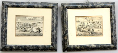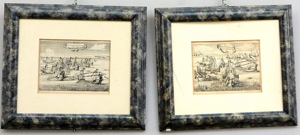 Coppia di stampe raffiguranti battaglie navali (cm 20x25) in cornici