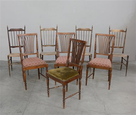Lotto composto da due gruppi di quattro sedie con schienale a listelli (difetti)