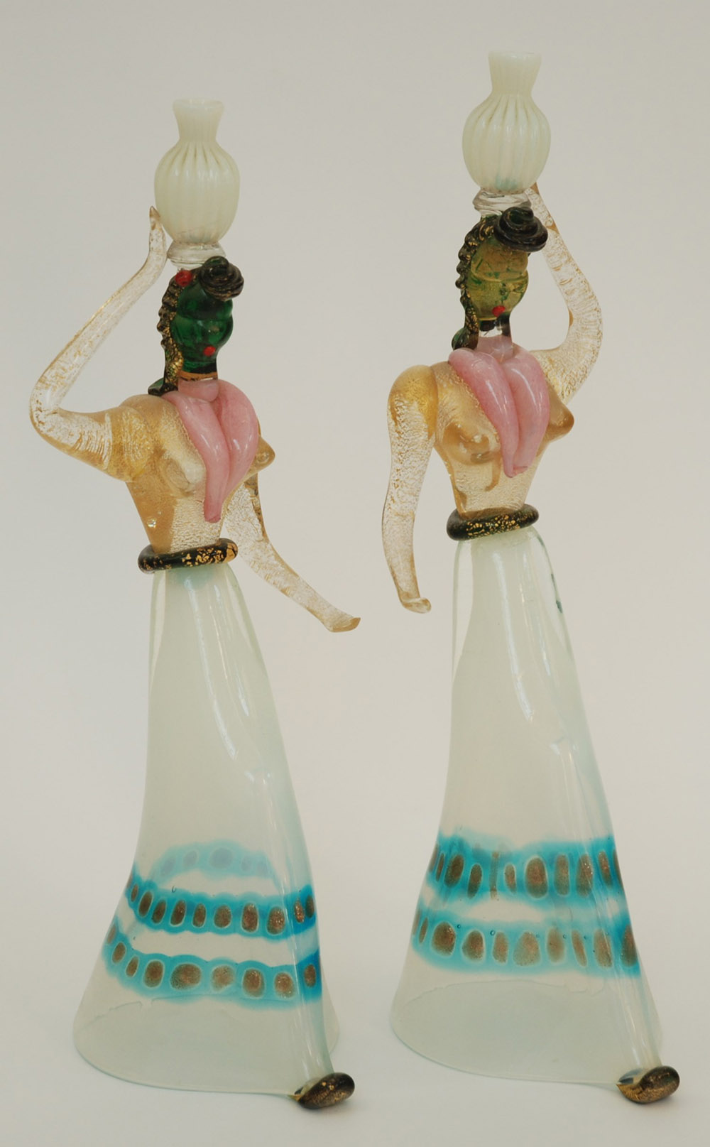 Manifattura di Murano, "Acquaiole" coppia di figure in vetro soffiato...